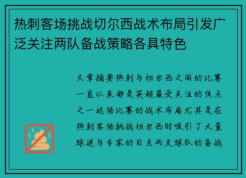 热刺与切尔西之间的比赛,一直以来都是英超最受关注的焦点之一。这场比赛的战术布局,尤其是在热刺客场挑战切尔西时,吸引了大量球迷与专家的目光。两支球队的备战策略各具特色,不仅在阵型选择上有所不同,在战术执行上也有着鲜明的对比。热刺近年来在战术上展现了更多的灵活性与反击能力,而切尔西则一直秉持着高控球、高压迫的打法。这篇文章将从四个方面深入剖析两队的备战策略及其背后的战术布局,包括阵型选择、球员角色定位、进攻与防守策略、以及心理战与比赛节奏控制。通过对比两队的不同风格与战术调整,本文旨在为读者呈现这场英超德比的精彩战术层面。