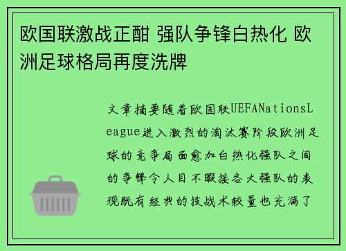 随着欧国联(UEFA Nations League)进入激烈的淘汰赛阶段,欧洲足球的竞争局面愈加白热化,强队之间的争锋令人目不暇接。各大强队的表现既有经典的技战术较量,也充满了不确定性与惊喜。新兴足球强国的崛起以及传统足球强国的复苏,给欧国联增添了许多悬念,足球格局也在此过程中发生了微妙的变化。本文将从四个方面分析这一现象:首先,欧国联作为赛事新星的崛起,重新塑造了欧洲足球格局;其次,强队之间的较量加剧了竞争的激烈度;第三,新兴球队的崛起推动了欧洲足球的多元化;最后,未来欧国联可能带来的变革与影响。本文通过这四个方面的分析,探讨了目前欧国联在国际足球舞台上的重要地位以及对欧洲足球格局的深远影响。