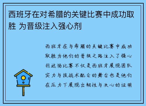 西班牙在与希腊的关键比赛中成功取胜,为他们的晋级之路注入了强心剂。这场比赛不仅是西班牙展现团队实力与技战术配合的舞台,也是他们在压力下展现出韧性与决心的证明。通过细致的战术分析、球员表现的深入探讨、心理素质的坚韧以及未来赛事的展望,本文将全面回顾西班牙如何在这场关键比赛中取得胜利,为接下来的晋级之旅奠定基础。